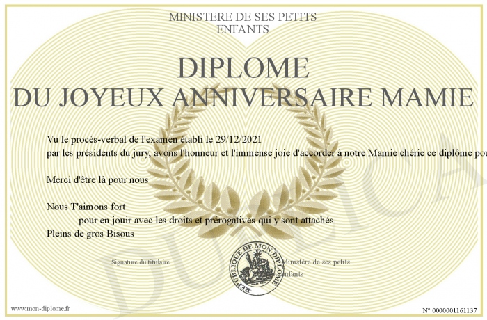 Envoyez par email votre Diplôme du Joyeux Anniversaire Mamie personalisé