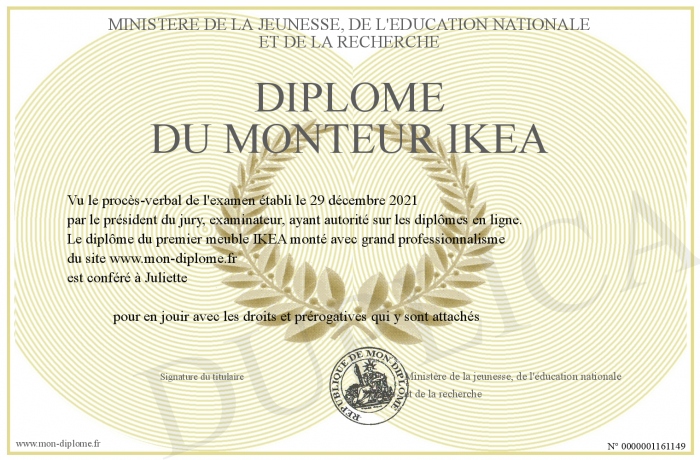 Envoyez par email votre Diplôme du monteur IKEA personalisé