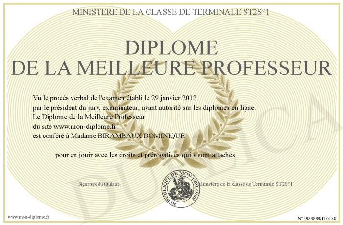 Envoyez par email votre Diplôme de la Meilleure Professeur personalisé