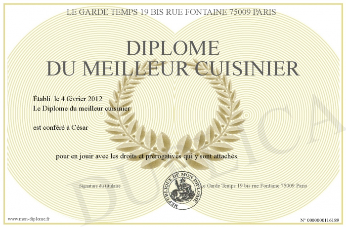 Envoyez par email votre Diplôme du meilleur cuisinier personalisé