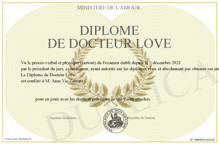 Envoyez par email votre Diplome de Docteur Love personalisé