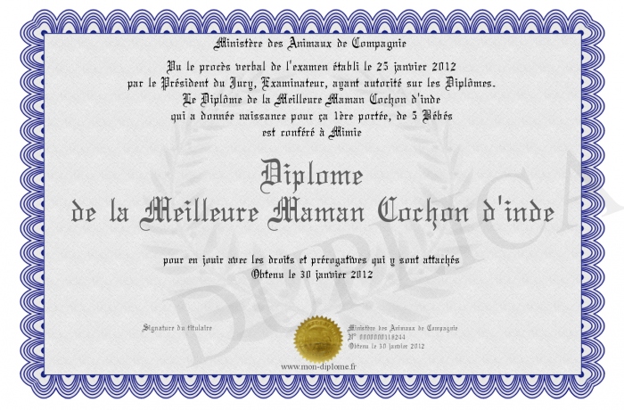 Envoyez par email votre Diplôme de la Meilleure Maman Cochon d'inde personalisé