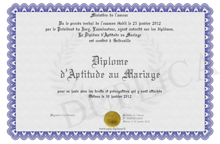 Envoyez par email votre Diplôme d'Aptitude au Mariage personalisé