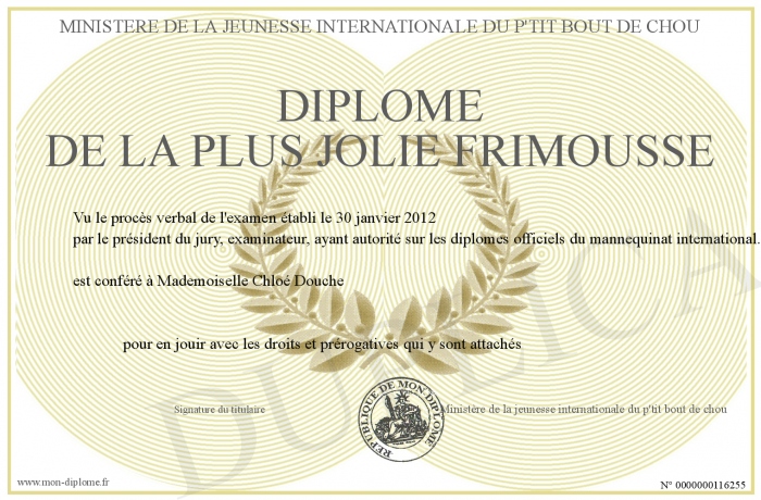 Envoyez par email votre Diplôme de la plus jolie frimousse personalisé