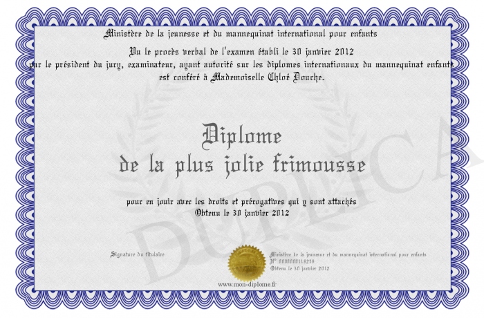 Envoyez par email votre Diplôme de la plus jolie frimousse personalisé
