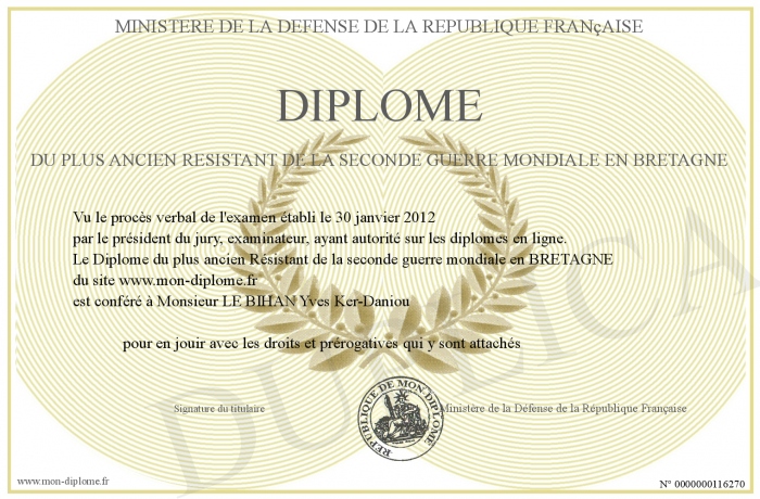 Envoyez par email votre Diplôme du plus ancien Résistant de la seconde guerre mondiale en BRETAGNE personalisé