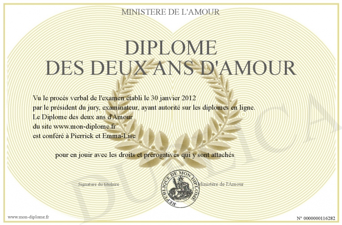 Envoyez par email votre Diplôme des deux ans d'Amour personalisé
