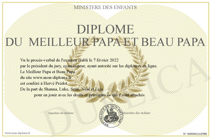 Envoyez par email votre Diplôme du Meilleur Papa et Beau Papa personalisé