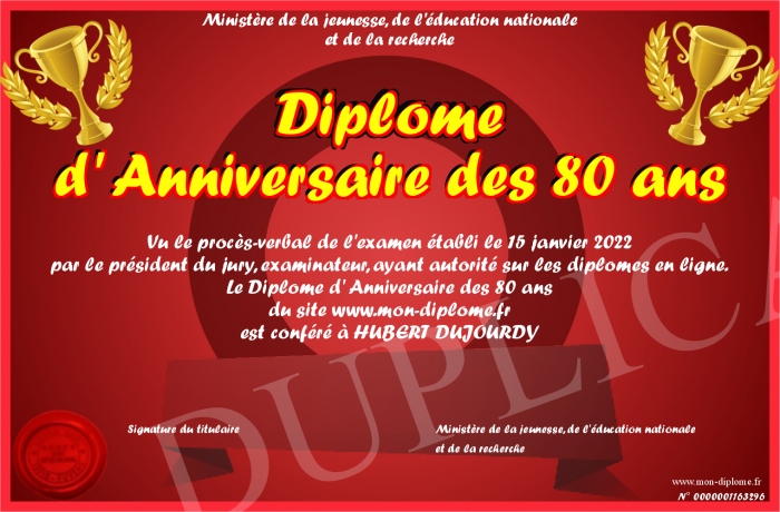 Envoyez par email votre Diplôme d' Anniversaire des 80 ans personalisé