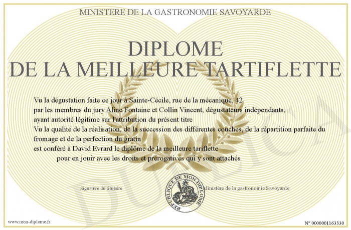 Envoyez par email votre Diplôme de la meilleure tartiflette personalisé