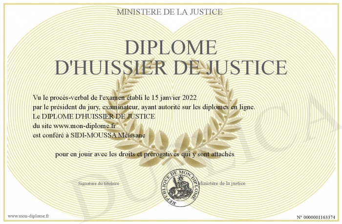 Envoyez par email votre DIPLOME D'HUISSIER DE JUSTICE personalisé