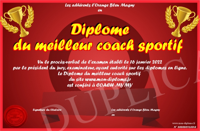 Envoyez par email votre Diplôme du meilleur coach sportif personalisé