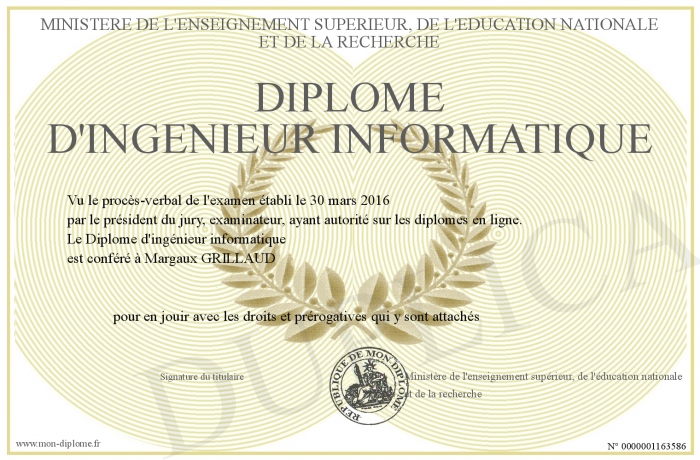 Envoyez par email votre Diplôme d'ingénieur informatique personalisé