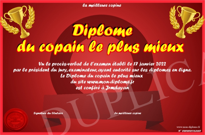 Envoyez par email votre Diplôme du copain le plus mieux personalisé