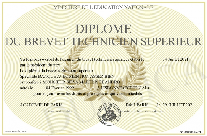Envoyez par email votre Diplôme du brevet technicien supérieur personalisé