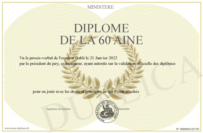 Envoyez par email votre Diplôme de la 60 aine personalisé
