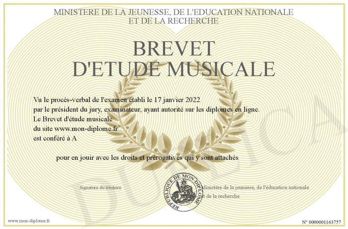 Envoyez par email votre Brevet d'étude musicale personalisé