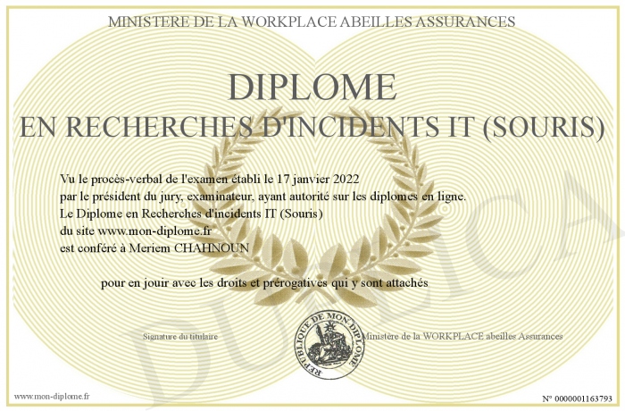 Envoyez par email votre Diplôme en Recherches d'incidents IT (Souris) personalisé