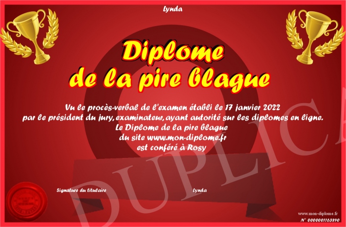 Envoyez par email votre Diplôme de la pire blague personalisé