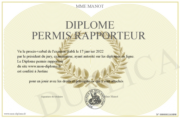 Envoyez par email votre Diplôme permis rapporteur personalisé