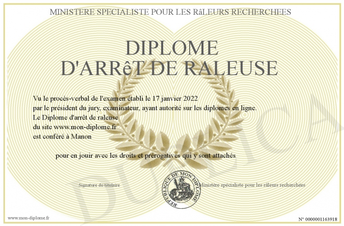 Envoyez par email votre Diplôme d'arrêt de raleuse personalisé