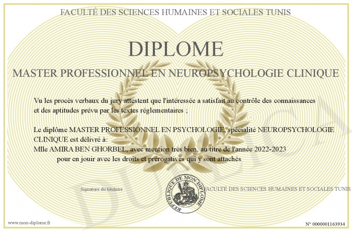 Envoyez par email votre Diplôme MASTER PROFESSIONNEL EN NEUROPSYCHOLOGIE CLINIQUE personalisé