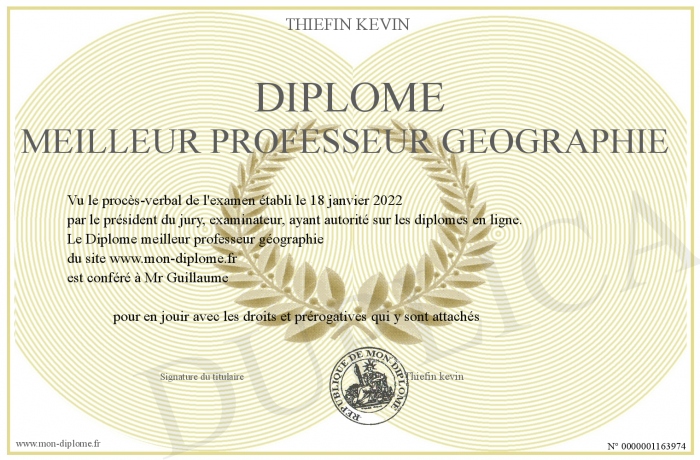 Envoyez par email votre Diplôme meilleur professeur géographie personalisé
