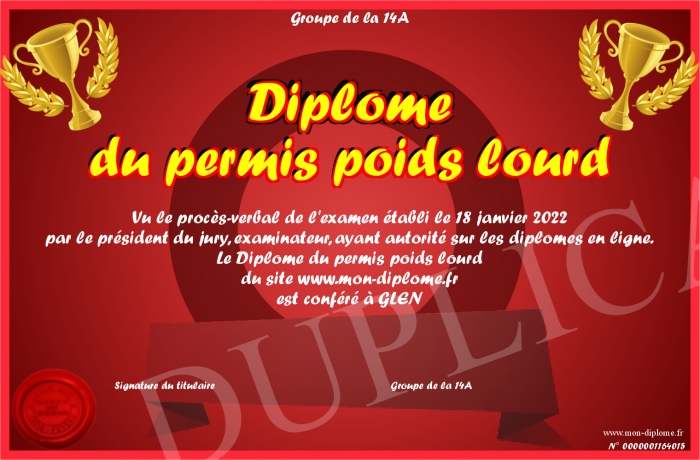 Envoyez par email votre Diplôme du permis poids lourd personalisé
