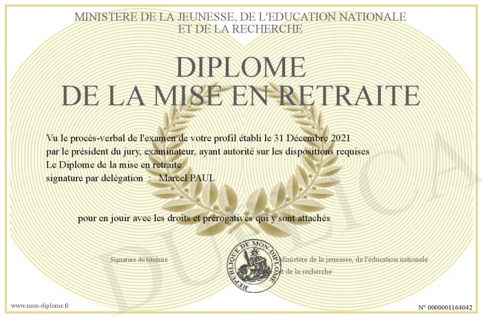 Envoyez par email votre Diplôme de la mise en retraite personalisé