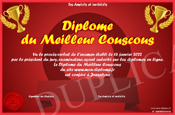Envoyez par email votre Diplôme du Meilleur Couscous personalisé