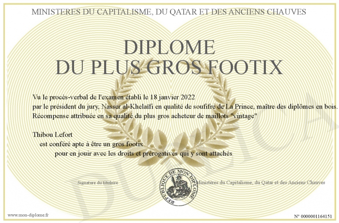 Envoyez par email votre Diplôme du plus gros footix personalisé