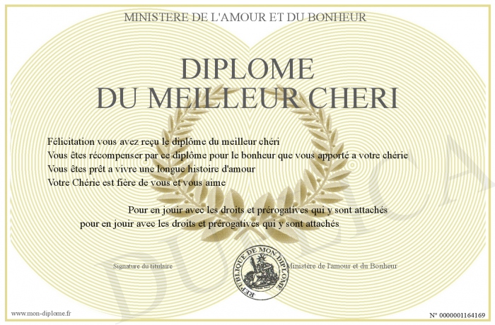 Envoyez par email votre Diplôme du meilleur Cheri personalisé