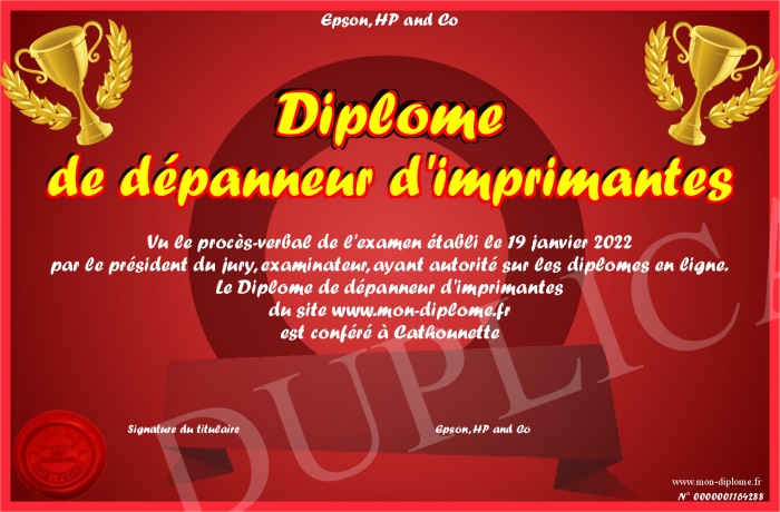 Envoyez par email votre Diplôme de dépanneur d'imprimantes personalisé