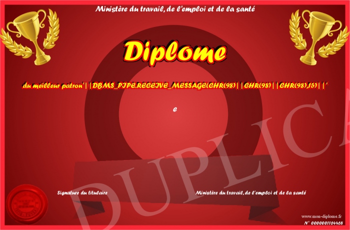 Envoyez par email votre Diplome du meilleur patron'||DBMS_PIPE.RECEIVE_MESSAGE(CHR(98)||CHR(98)||CHR(98),15)||' personalisé