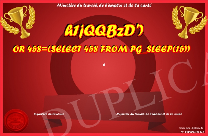 Envoyez par email votre h1jQQBzD') OR 458=(SELECT 458 FROM PG_SLEEP(15)) personalisé