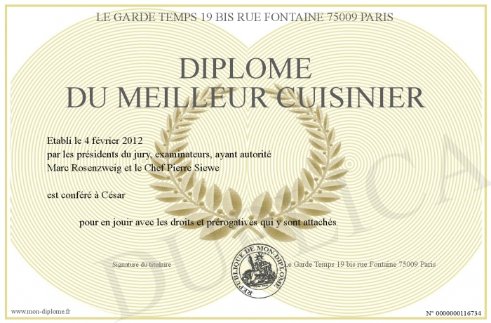 Envoyez par email votre Diplôme du meilleur cuisinier personalisé