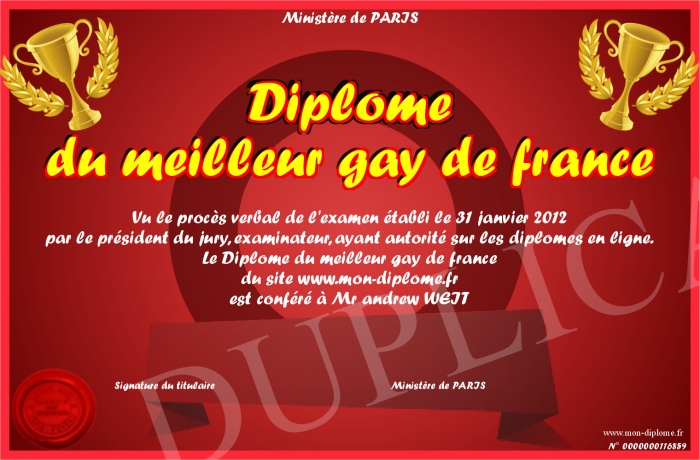 Envoyez par email votre Diplôme du meilleur gay de france personalisé