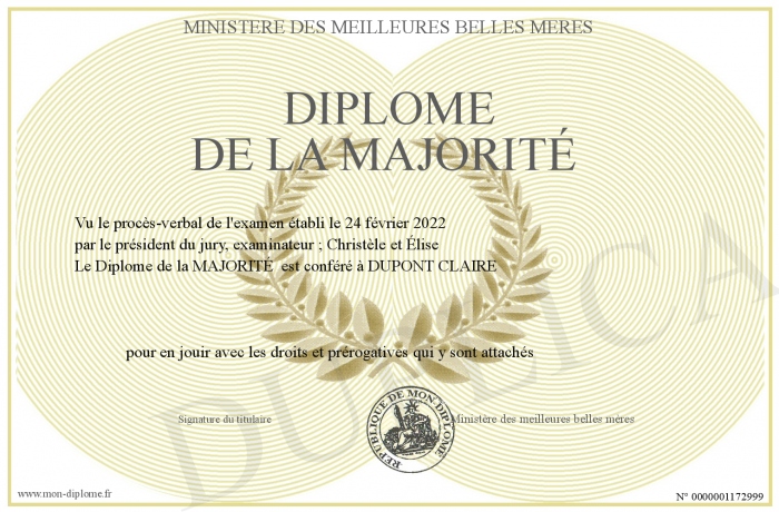 Envoyez par email votre Diplôme de la MAJORITÉ personalisé