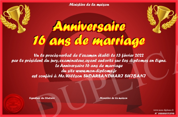 Envoyez par email votre Anniversaire 16 ans de marriage personalisé