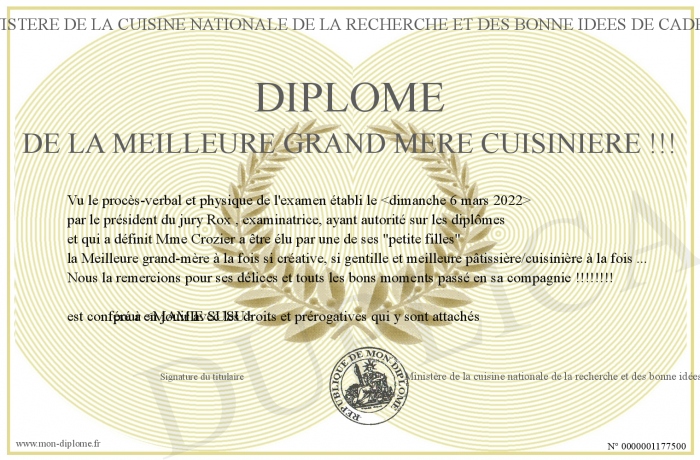 Envoyez par email votre Diplôme de la meilleure grand mère cuisinière !!! personalisé