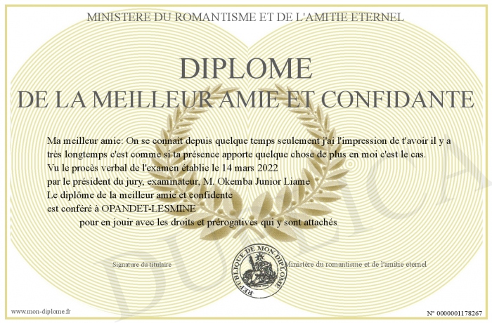 Envoyez par email votre Diplôme de la meilleur amie et confidante personalisé