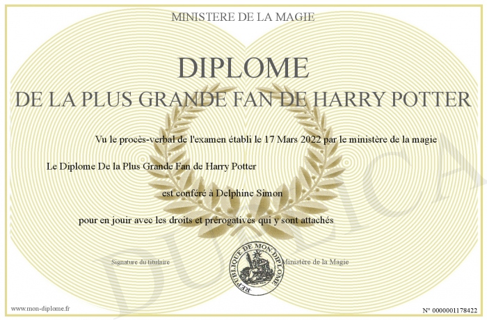 Envoyez par email votre Diplôme De la Plus Grande Fan de Harry Potter personalisé