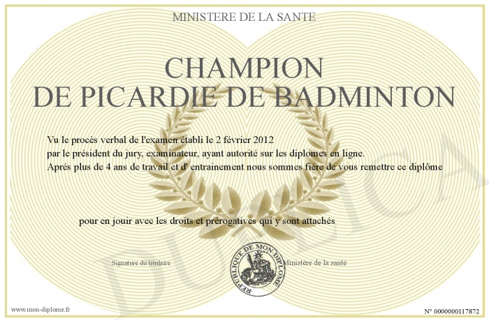 Envoyez par email votre Champion de Picardie de badminton personalisé