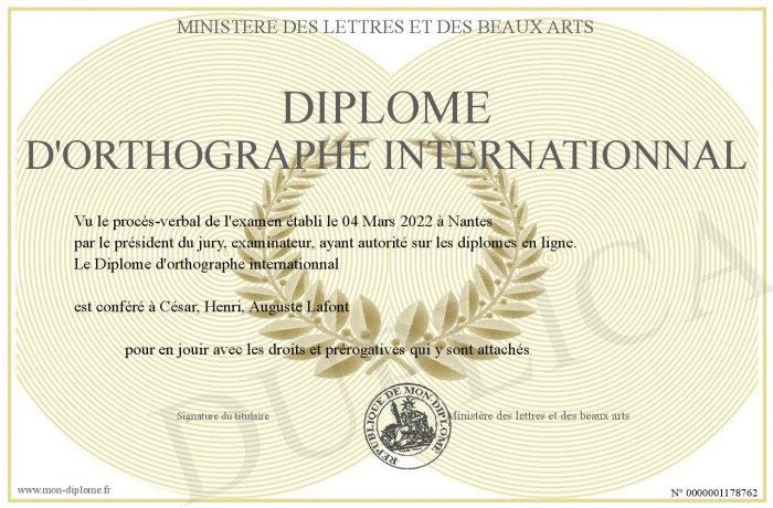 Envoyez par email votre Diplôme d'orthographe internationnal personalisé
