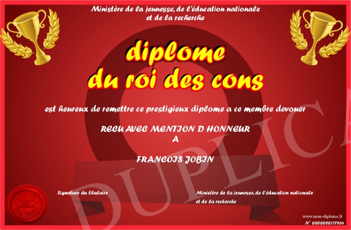 Envoyez par email votre diplome du roi des cons personalisé
