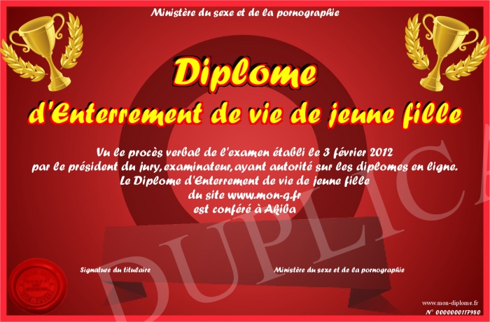 Envoyez par email votre Diplome d'Enterrement de vie de jeune fille personalisé
