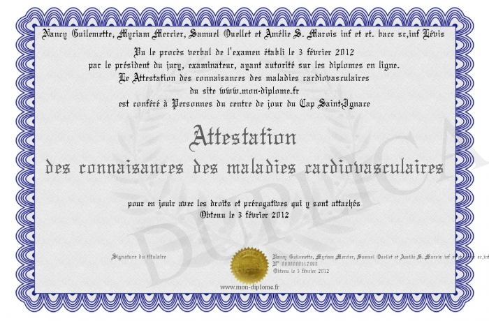 Envoyez par email votre Attestation des connaisances des maladies cardiovasculaires personalisé