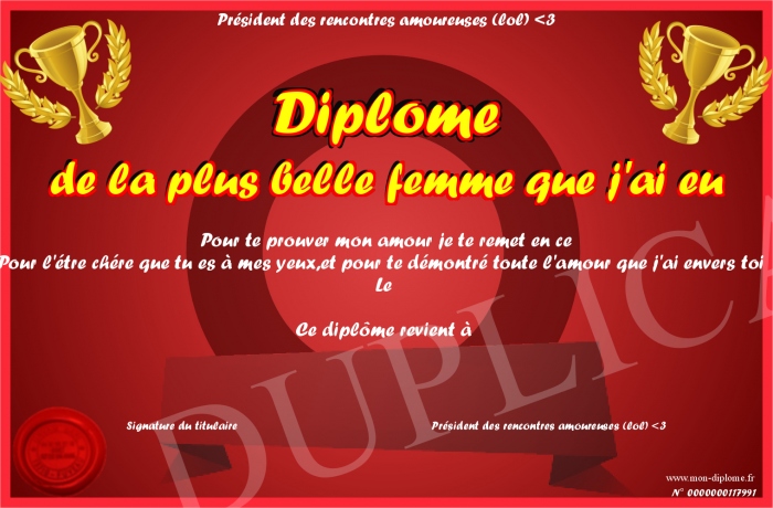 Envoyez par email votre Diplôme de la plus belle femme que j'ai eu personalisé