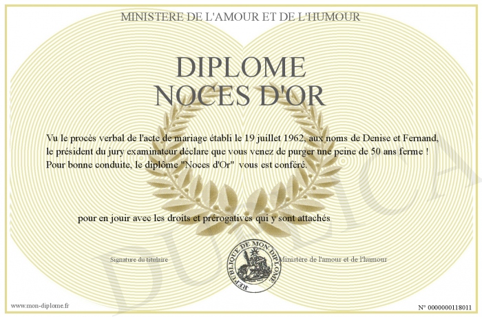 Envoyez par email votre Diplôme noces d'or personalisé