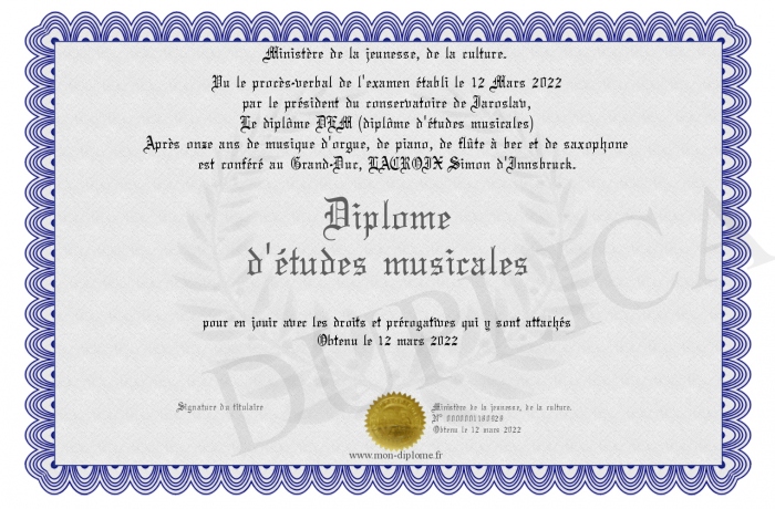 Envoyez par email votre Diplôme d'études musicales personalisé